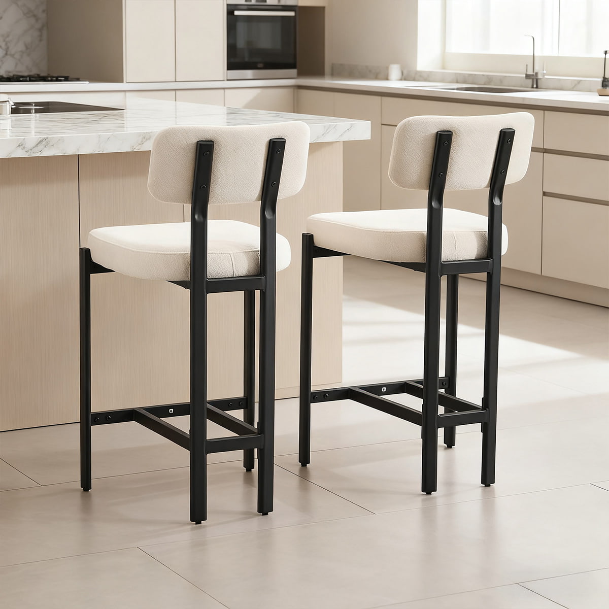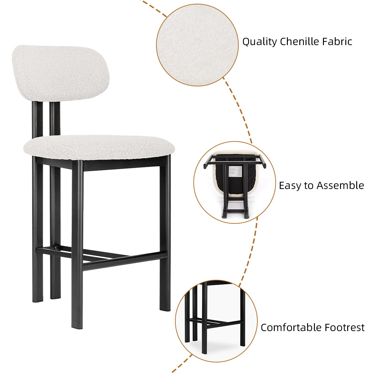 Kursi Bar Tinggi Konter BeigeChenille Modern — Kursi Bar Belakang Melengkung Berlapis dengan Kaki Logam dan Pijakan Kaki untuk Pulau Dapur, Bar Rumah, atau Ruang Makan