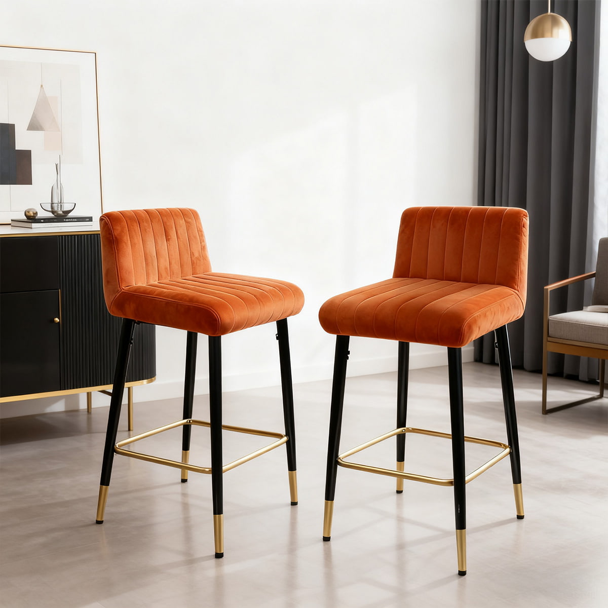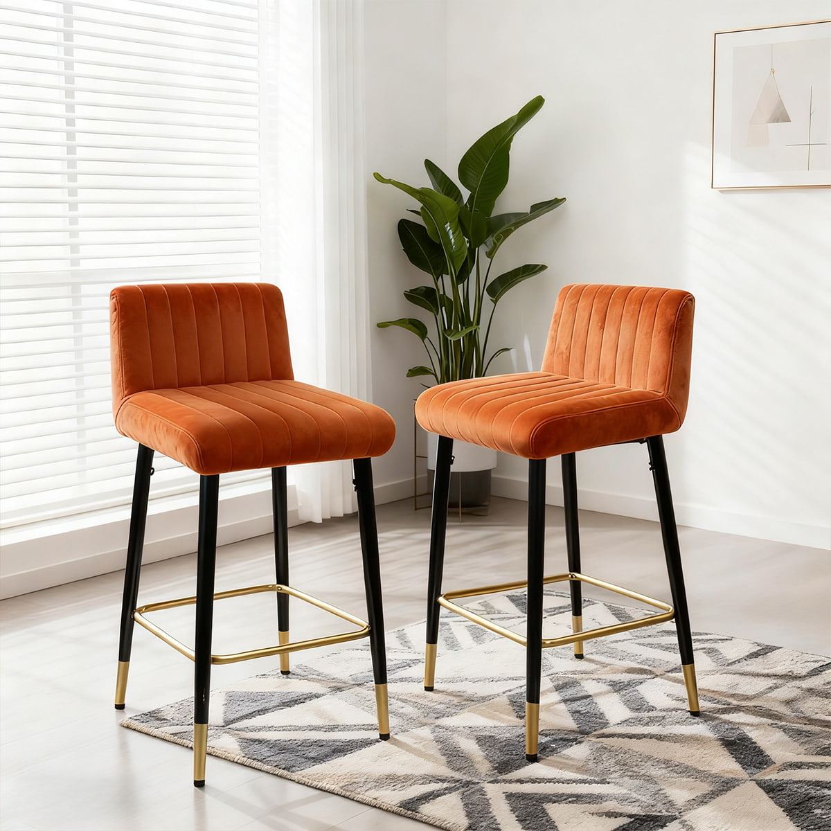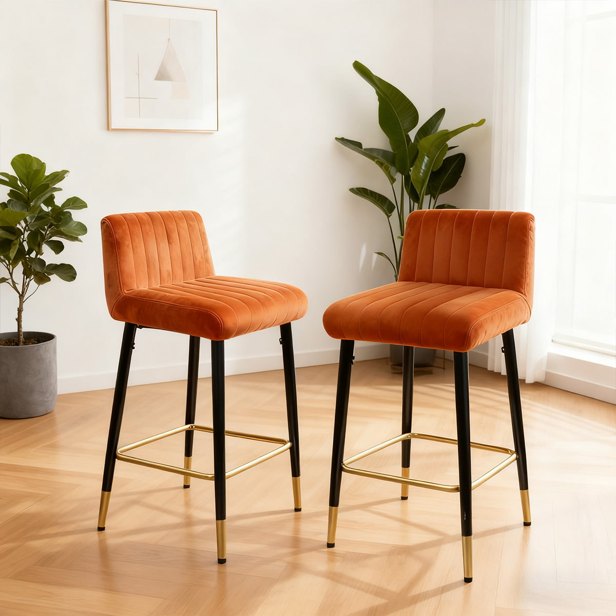Kursi Bar Beludru Oranye Ochre Modern — Kursi Tinggi Penghitung Putar 360° dengan Kaki Logam Hitam & Emas, Kursi Berlapis Lembut, dan Pijakan Kaki untuk Pulau Dapur, Bar, atau Ruang Makan