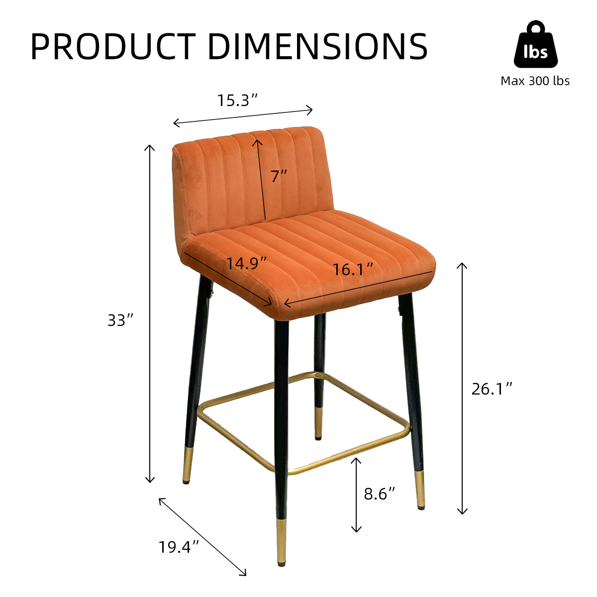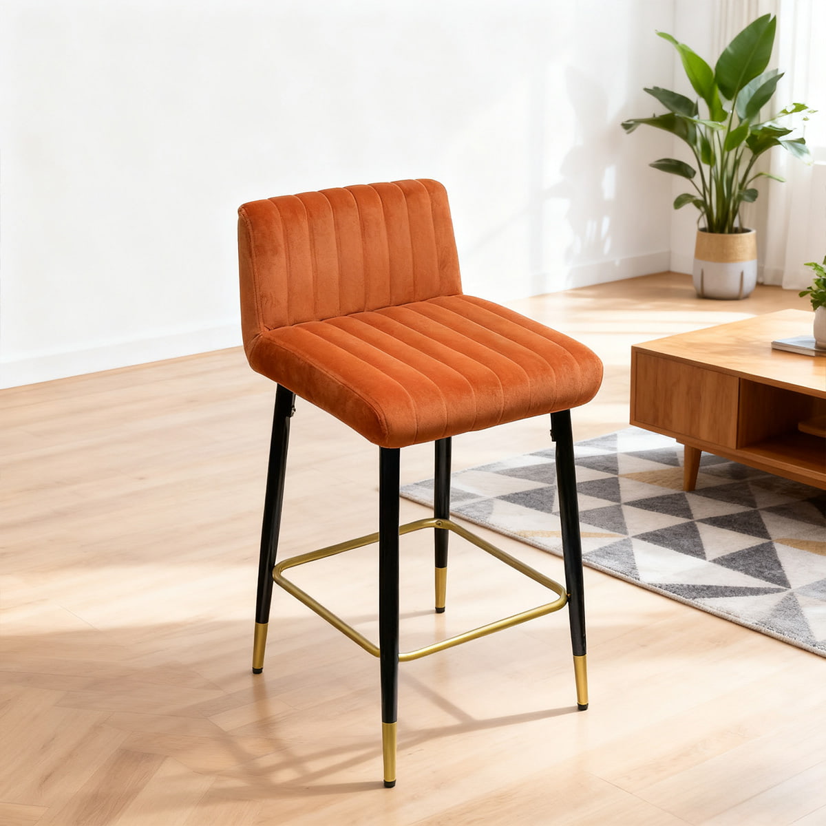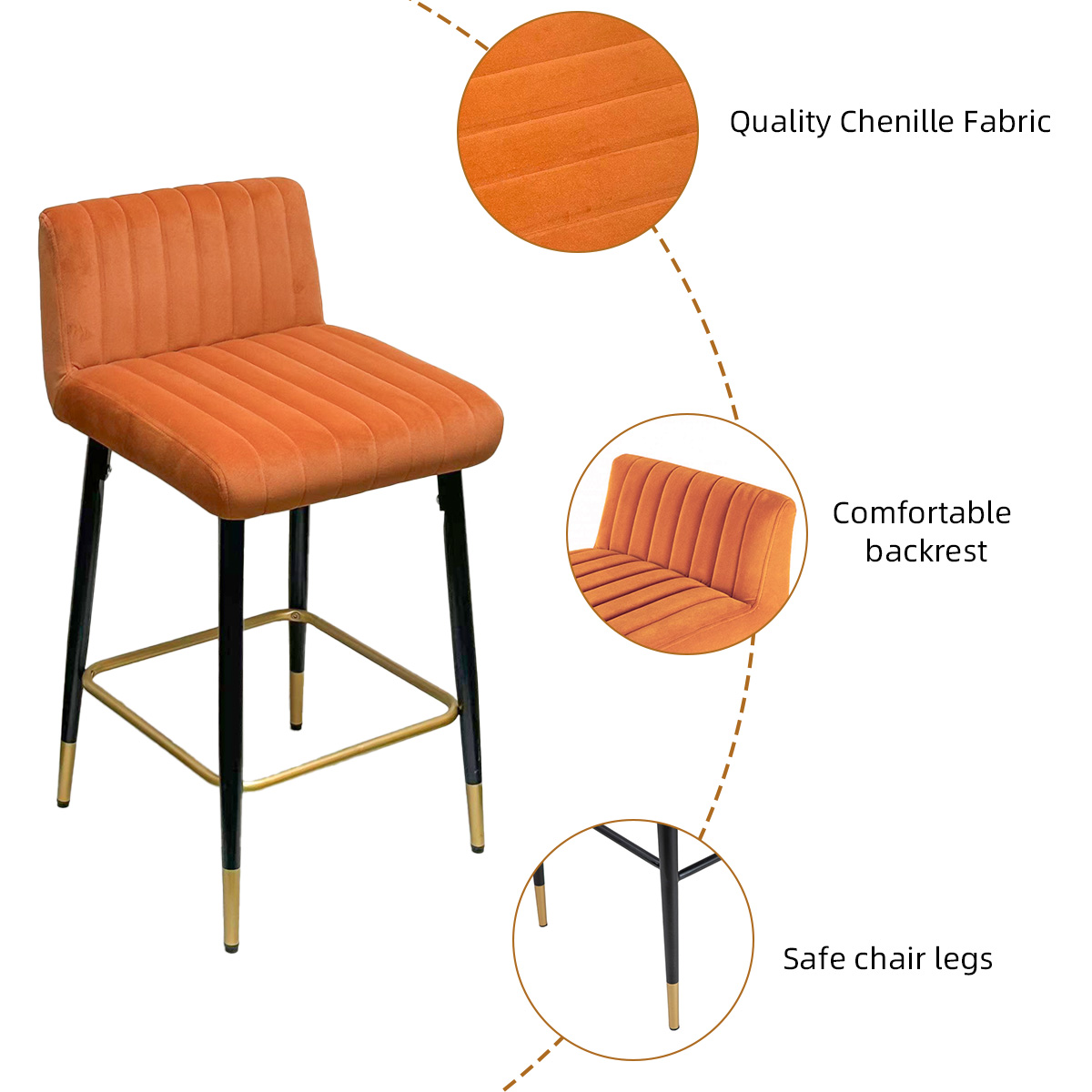 Kursi Bar Beludru Oranye Ochre Modern — Kursi Tinggi Penghitung Putar 360° dengan Kaki Logam Hitam & Emas, Kursi Berlapis Lembut, dan Pijakan Kaki untuk Pulau Dapur, Bar, atau Ruang Makan