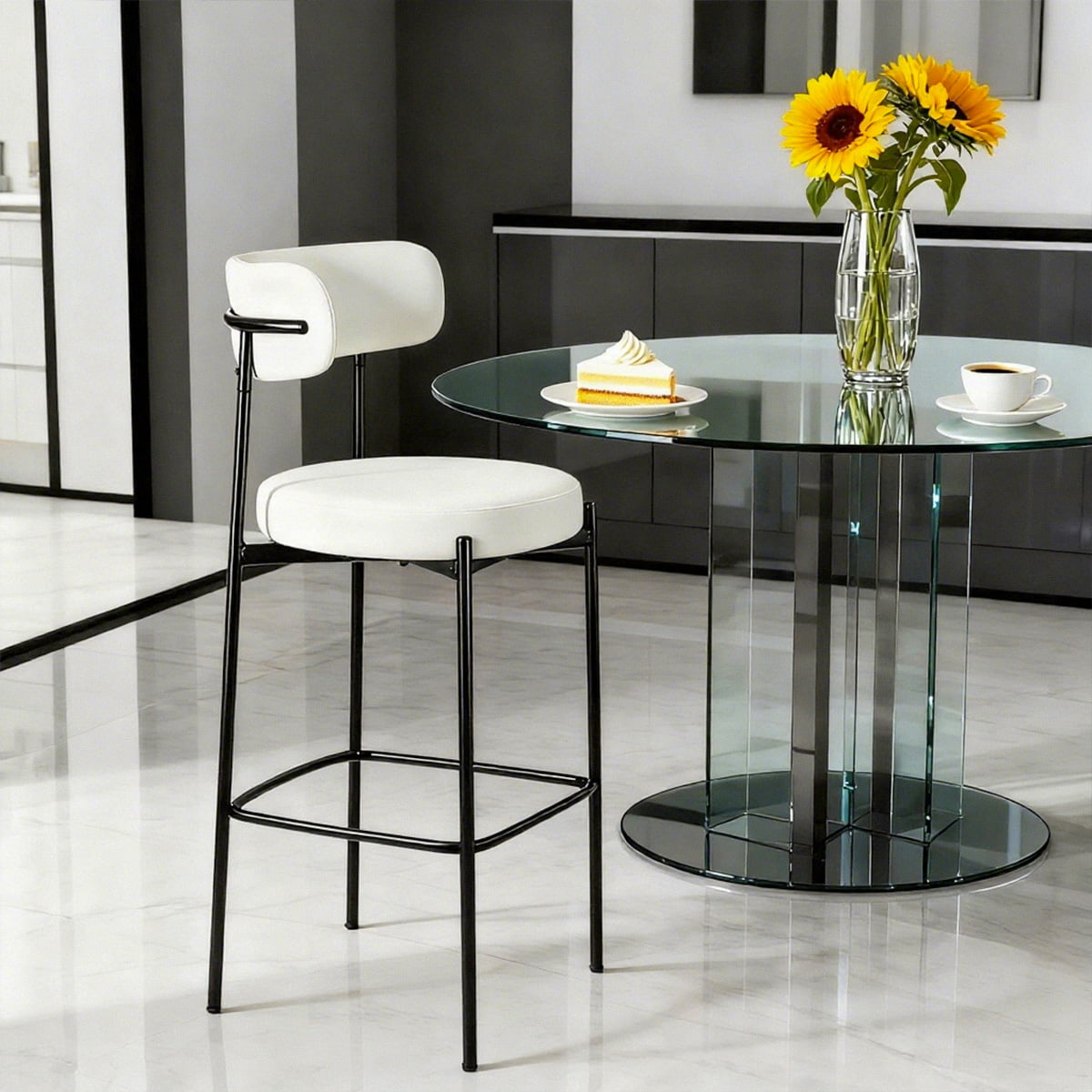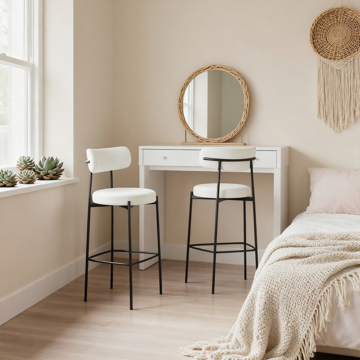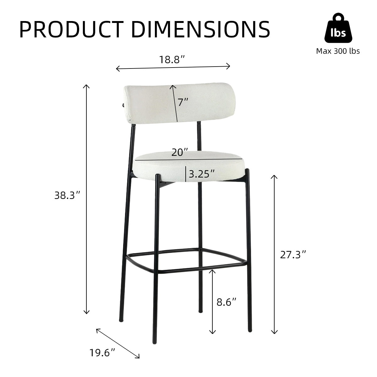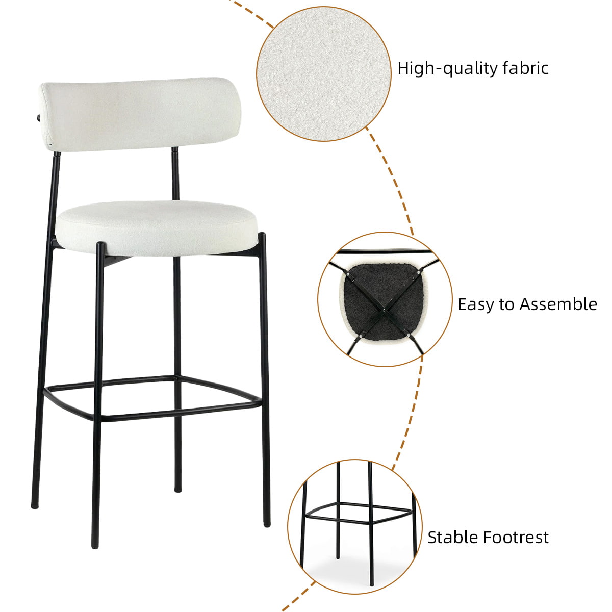 Kursi Bar Bouclé Putih Modern dengan Kaki Logam Hitam — Kursi Bar Counter Height Berlapis dengan Sandaran dan Sandaran Kaki untuk Pulau Dapur, Ruang Makan, dan Bar Rumah