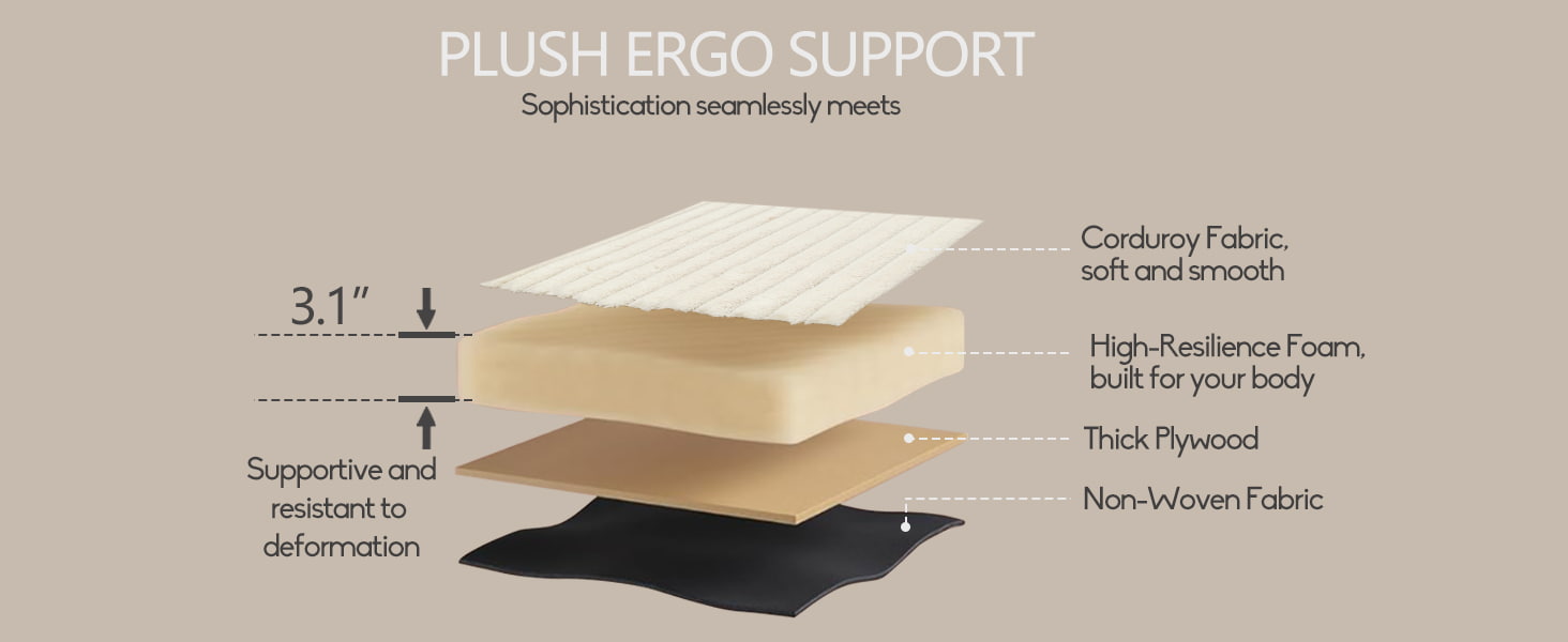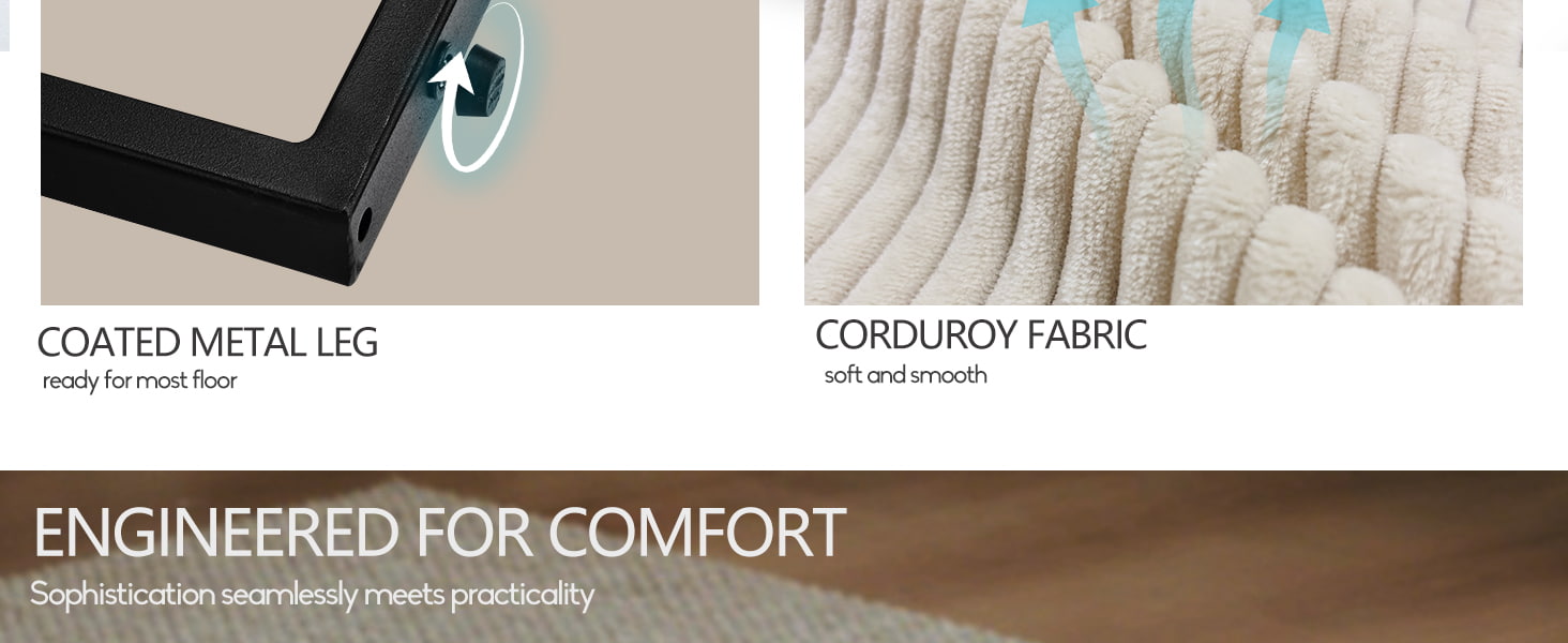 ● Pelapis Korduroi Mewah: Kain korduroi boucle dengan sentuhan lembut menawarkan nuansa hangat dan bertekstur namun tetap tahan lama dan mudah dirawat.