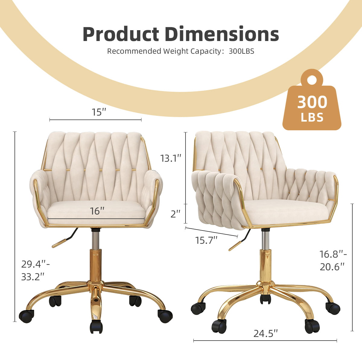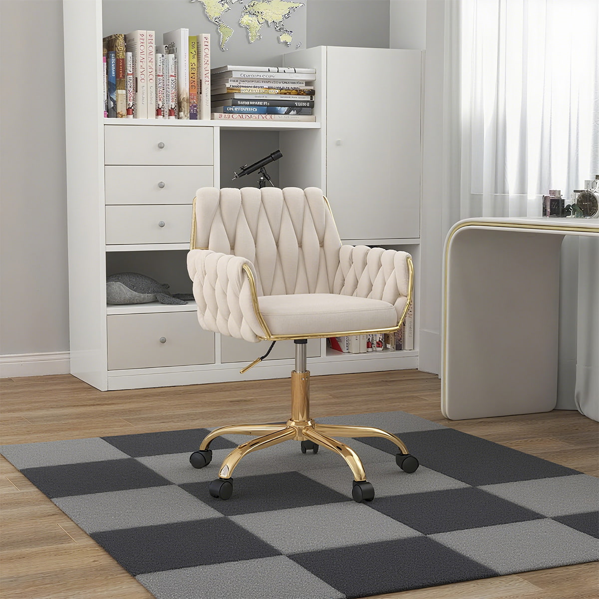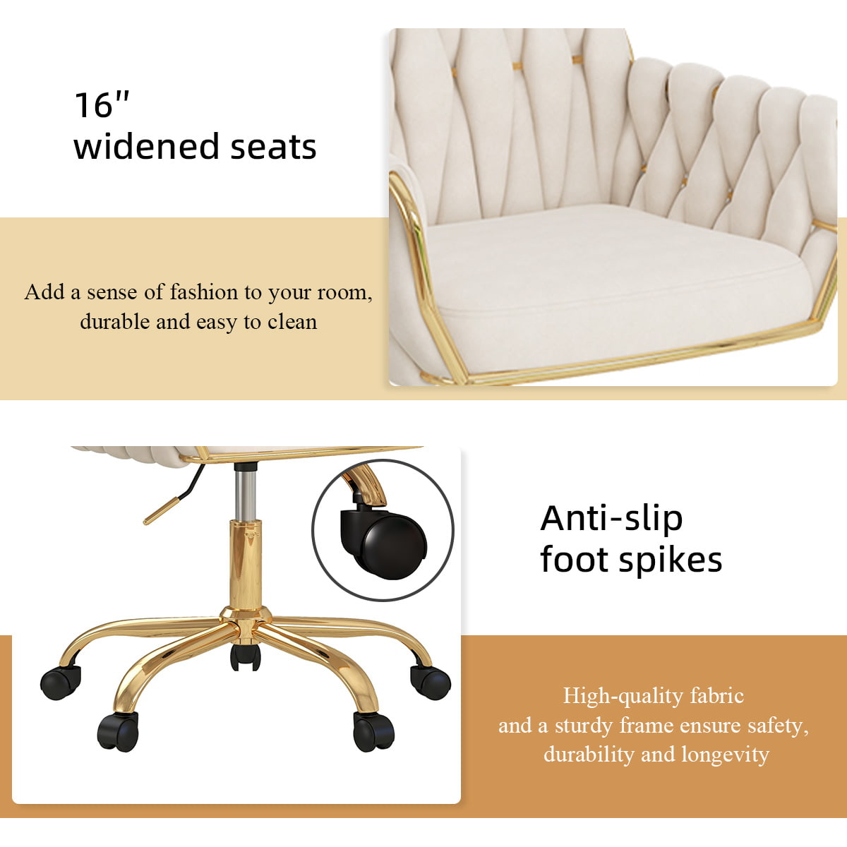 Kursi Kantor Rumah Beludru Krem – Kursi Rias Modern yang Dapat Disesuaikan dengan Alas Emas, Sandaran Tangan & Sandaran Tangan Tenun Tangan, Kursi Meja Putar Putar 360°