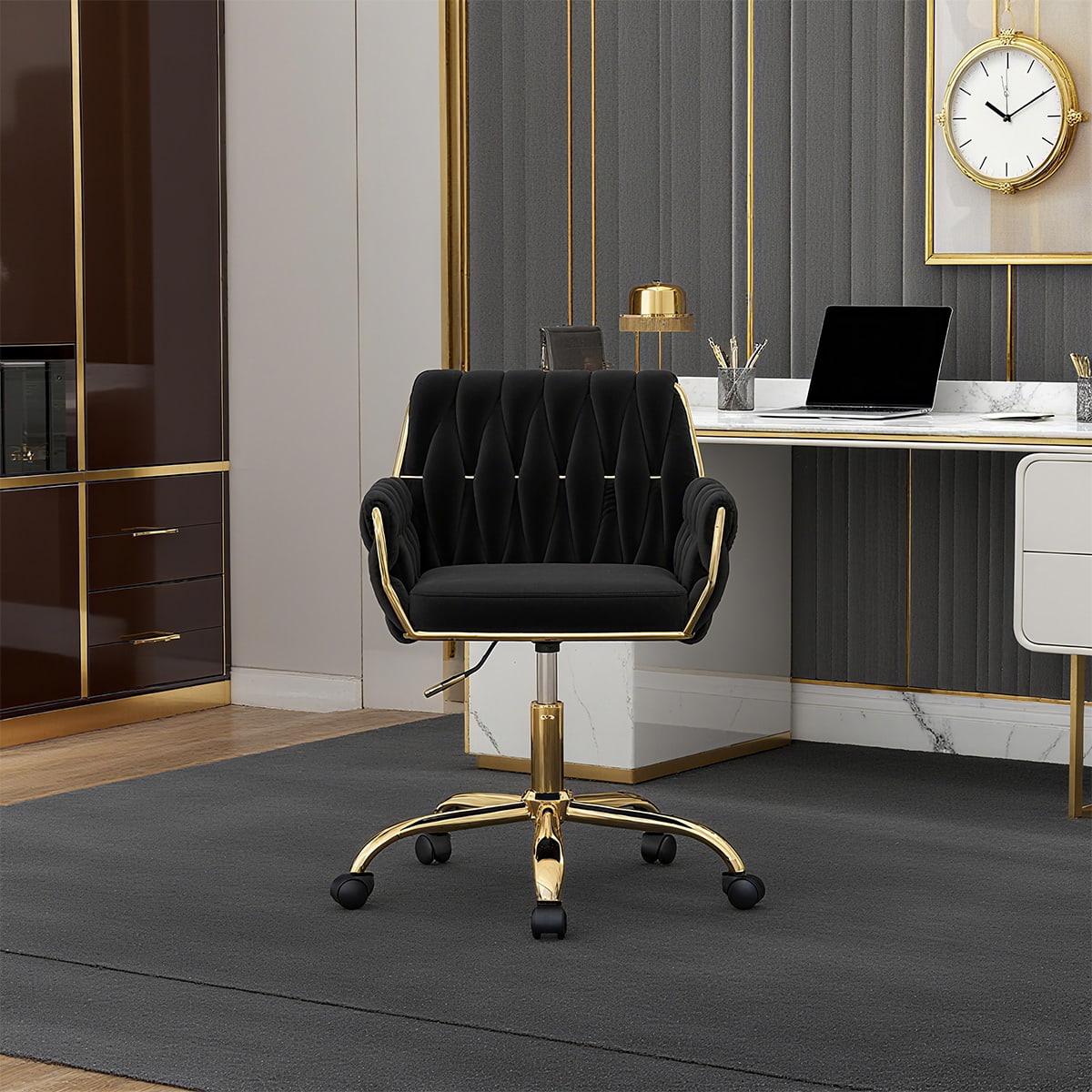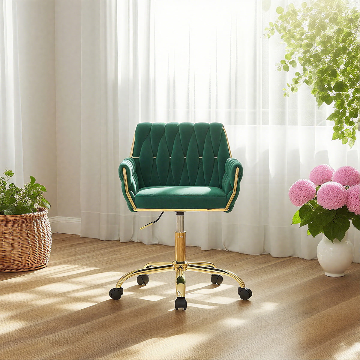 Kursi kantor beludru krem modern dengan alas emas ini adalah kursi rias yang ideal, kursi meja kantor rumah, dan kursi putar ruang belajar. Dilengkapi pelapis beludru mewah, sandaran anyaman ergonomis, sandaran lengan empuk, dan ketinggian tempat duduk yang dapat disesuaikan, kursi ini memastikan kenyamanan sepanjang hari sekaligus menyempurnakan dekorasi interior Anda. Basis putar 360° dengan roda halus membuatnya serbaguna untuk bekerja, merias wajah, membaca, atau bermain game.