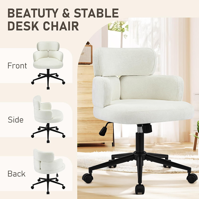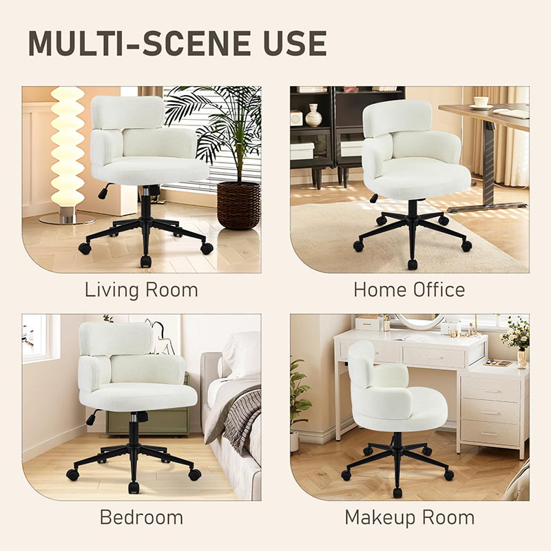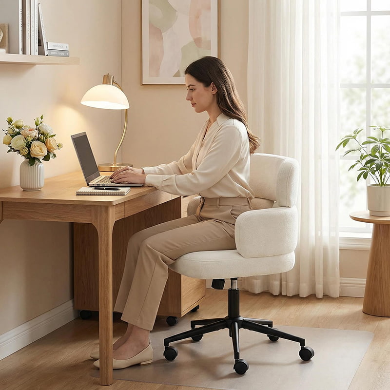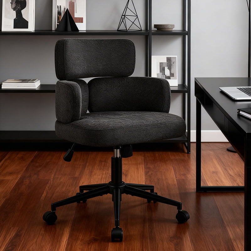 Kursi kantor putar berlapis kain ini dirancang untuk kantor rumah modern, ruang kerja butik, dan interior yang berfokus pada gaya hidup. Menampilkan sandaran khas berbentuk semanggi dengan penyangga lengan terintegrasi, kursi ini memadukan daya tarik visual dengan ergonomi fungsional. Kursi lebar dengan bantalan lembut dilapisi kain chenille yang ramah kulit, menawarkan pengalaman duduk yang mewah dan nyaman selama berjam-jam bekerja, membaca, atau bersantai. Mekanisme ketinggian yang dapat disesuaikan, putaran 360 derajat yang mulus, dan fungsi goyang yang lembut memungkinkan pengguna menyesuaikan posisi tempat duduk dengan mudah, sementara dasar logam yang kokoh dan roda putar yang senyap memastikan stabilitas, mobilitas, dan perlindungan lantai di berbagai lingkungan.