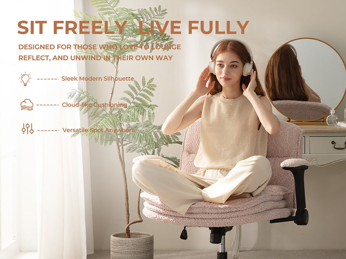 Sandaran tangan flip-up memaksimalkan fleksibilitas—duduk bersila, menyamping, meringkuk, atau tegak dengan mudah. Kursi ini dibuat untuk kenyamanan, pergerakan, dan gaya, sangat cocok untuk kantor rumah, kamar tidur, dan ruang kreatif.