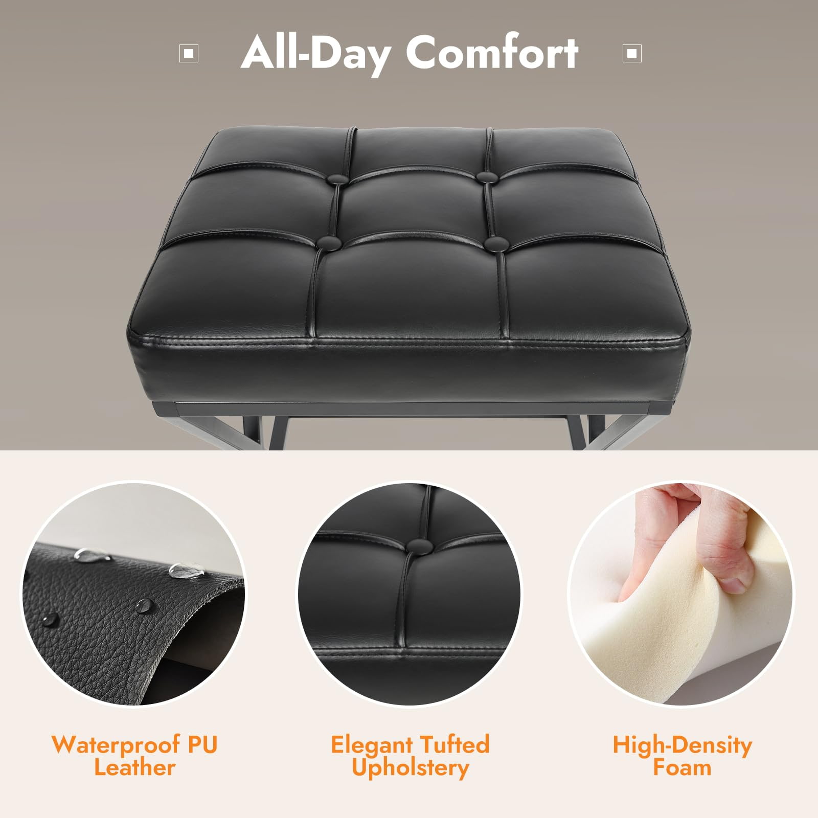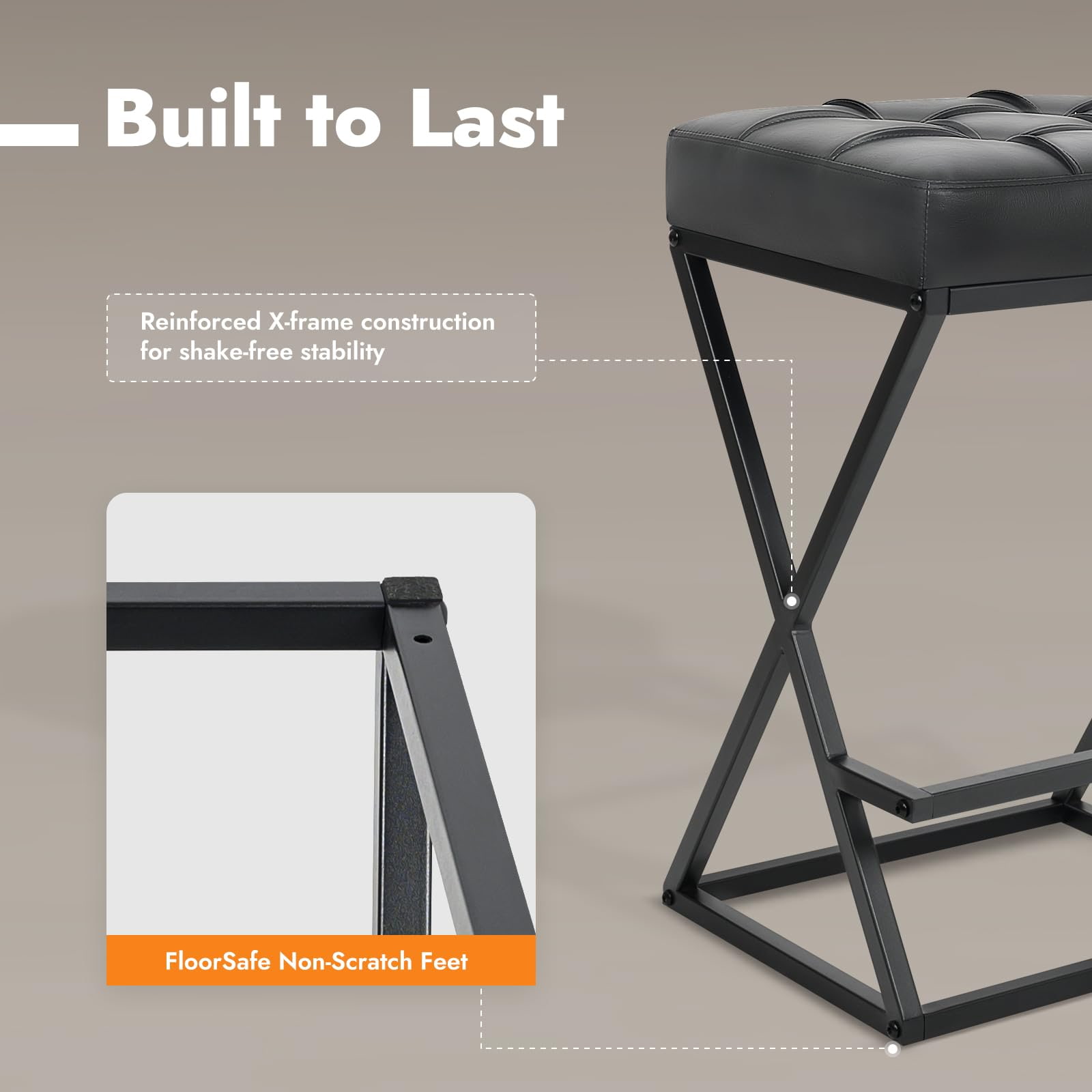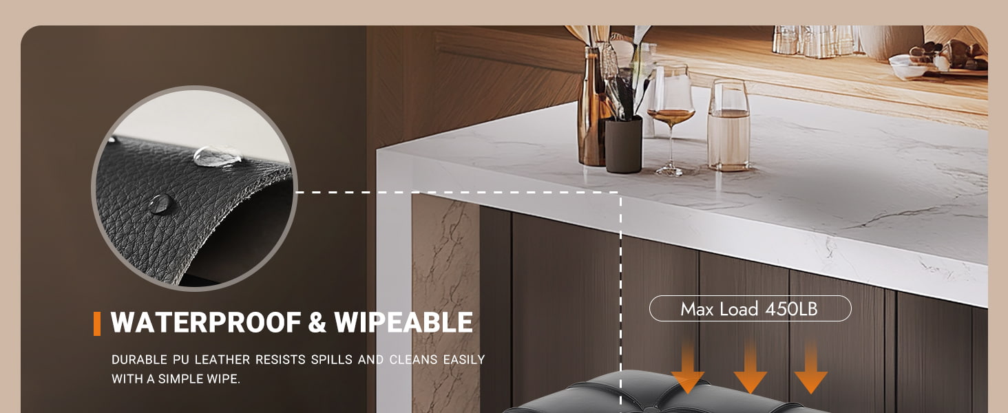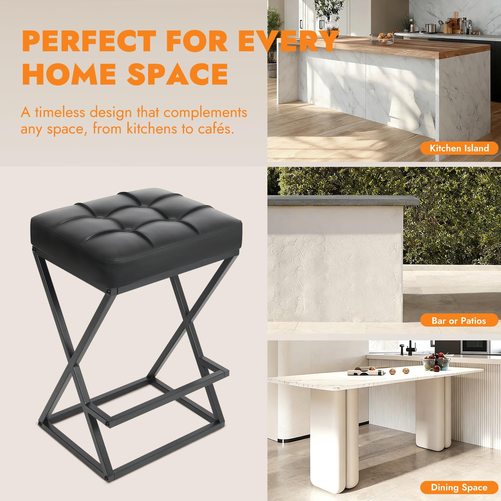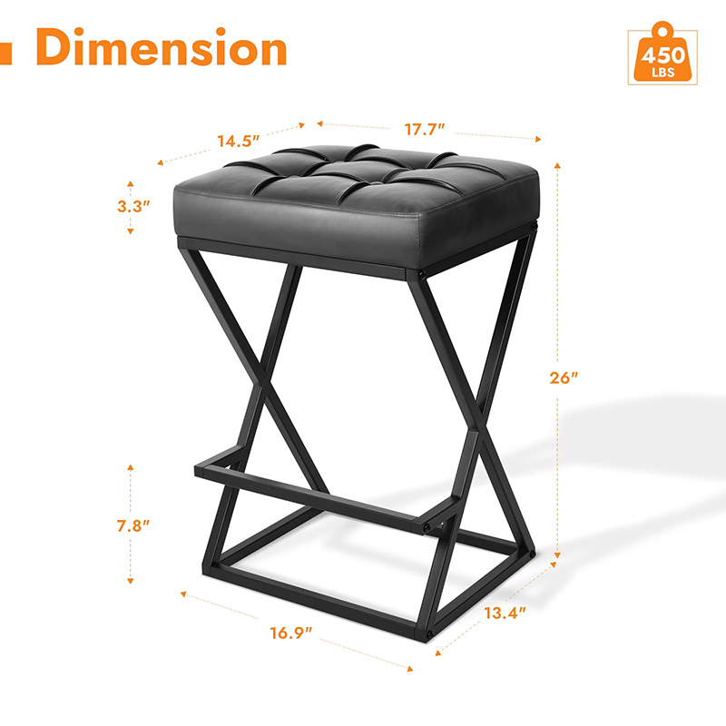 Didesain untuk lingkungan perumahan dan komersial ringan, kursi bar tanpa sandaran dengan ketinggian counter ini dilengkapi dengan struktur logam rangka X yang diperkuat, jok kulit imitasi berlapis busa kepadatan tinggi, dan tapak kompak yang ideal untuk dapur, apartemen, kafe, dan proyek perhotelan. Ketinggian tempat duduk 26 inci sesuai dengan meja dan meja dapur standar, sedangkan desain tanpa sandaran memungkinkan bangku dapat digeser sepenuhnya ke bawah, memaksimalkan ruang yang dapat digunakan.