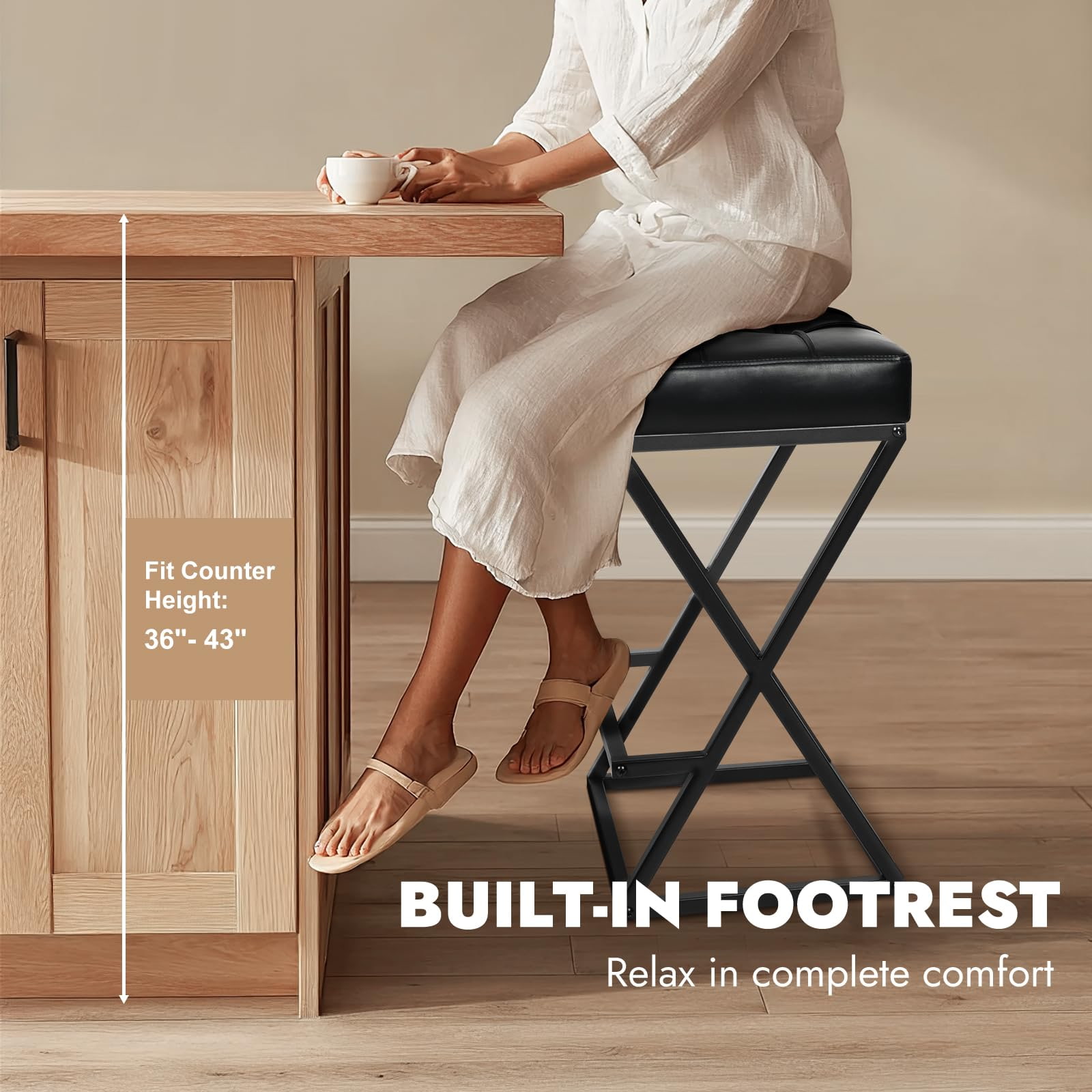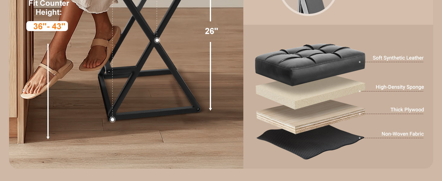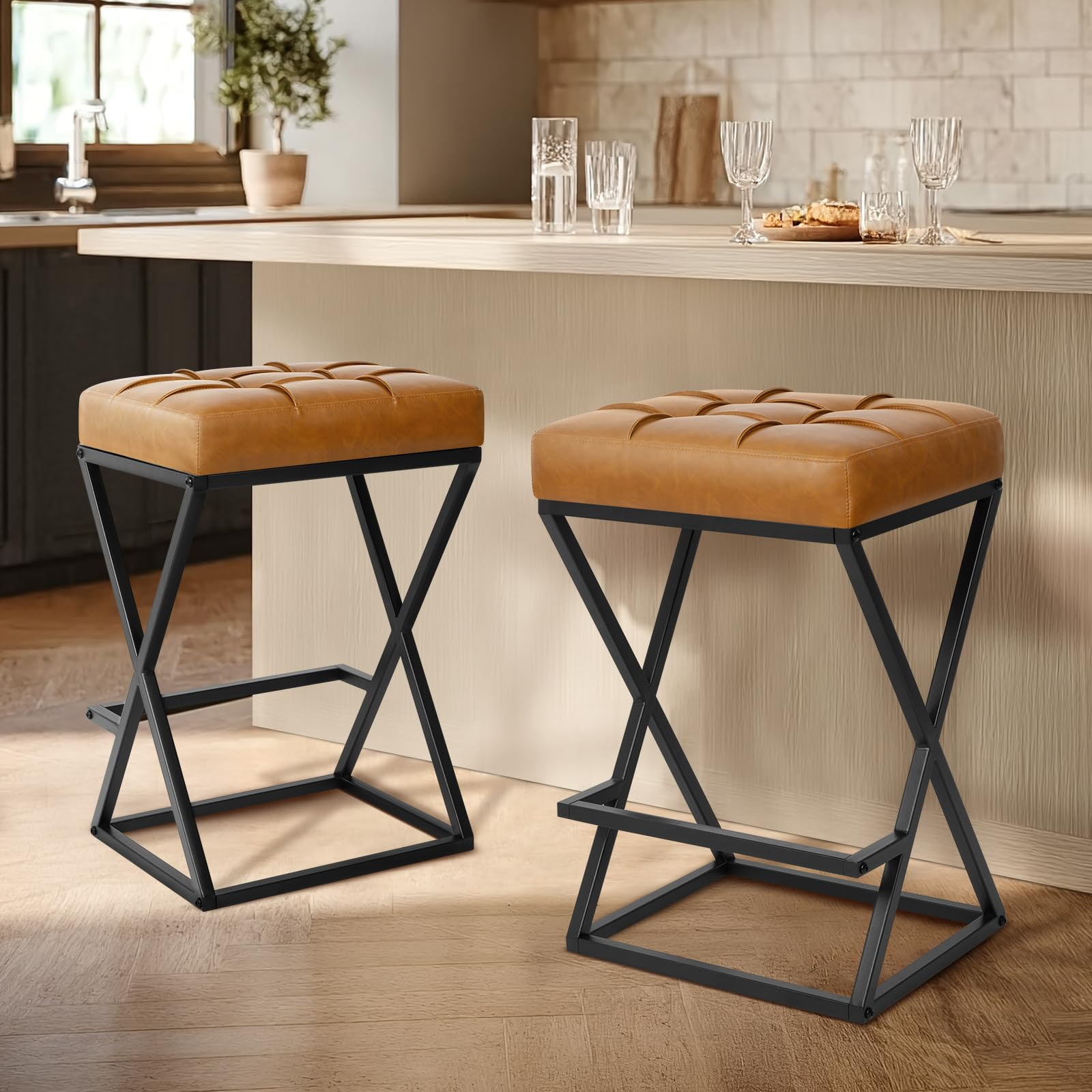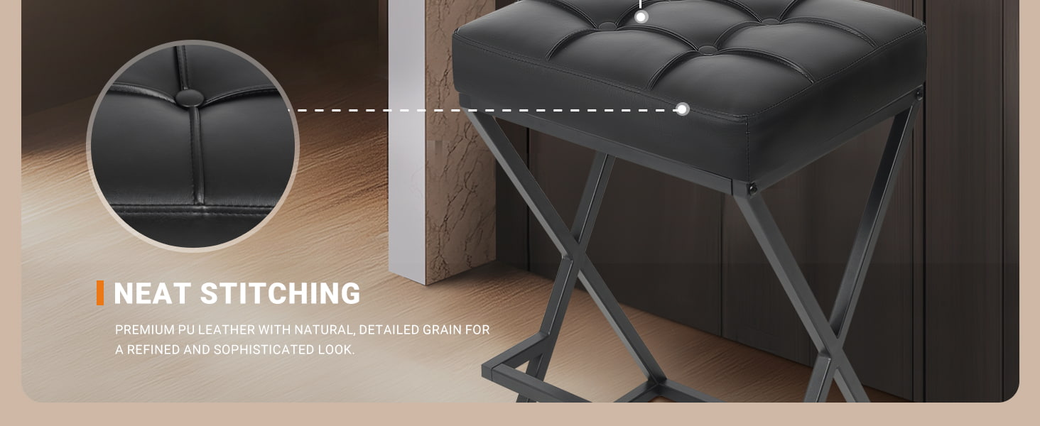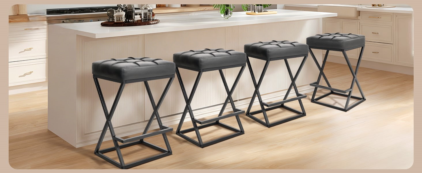 Kursi Bar Backless Counter Height dengan Kursi Kulit Berlapis, Stabilitas Logam Rangka X dengan Pijakan Kaki untuk Pulau Dapur Hitam