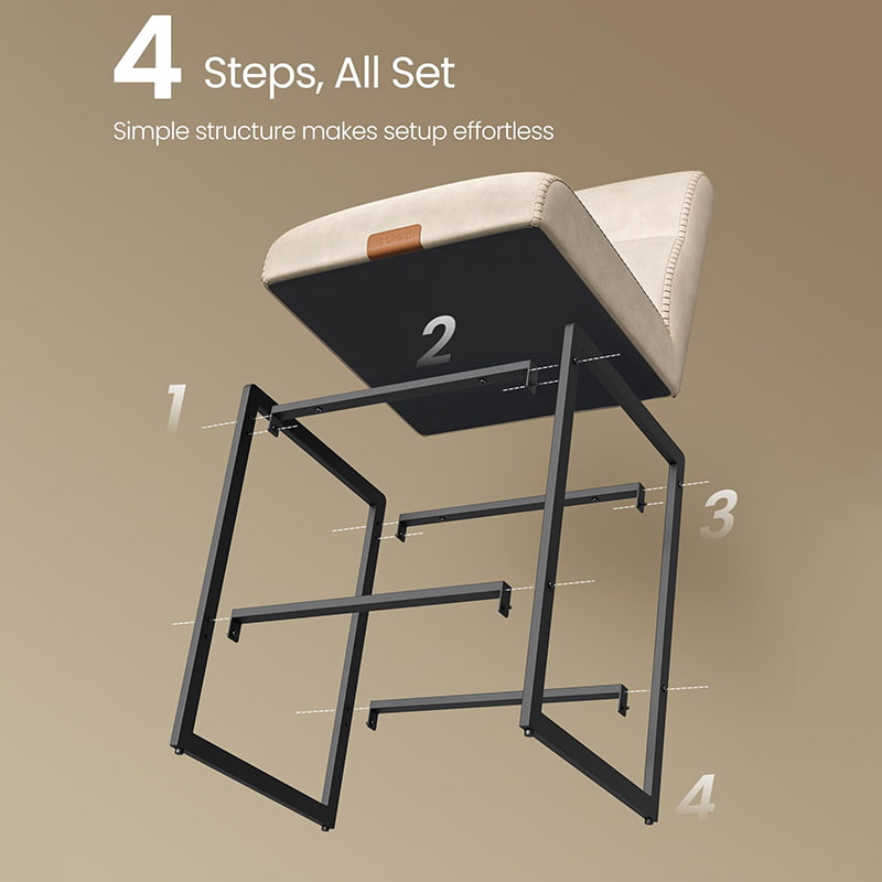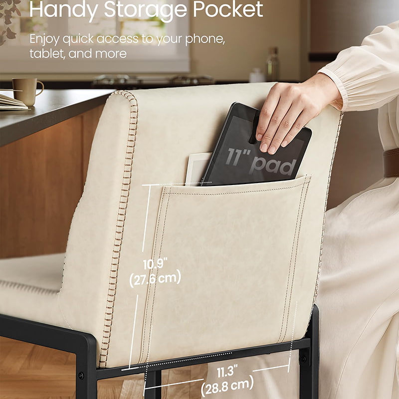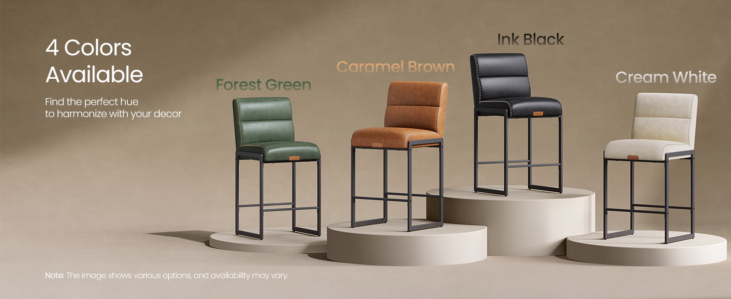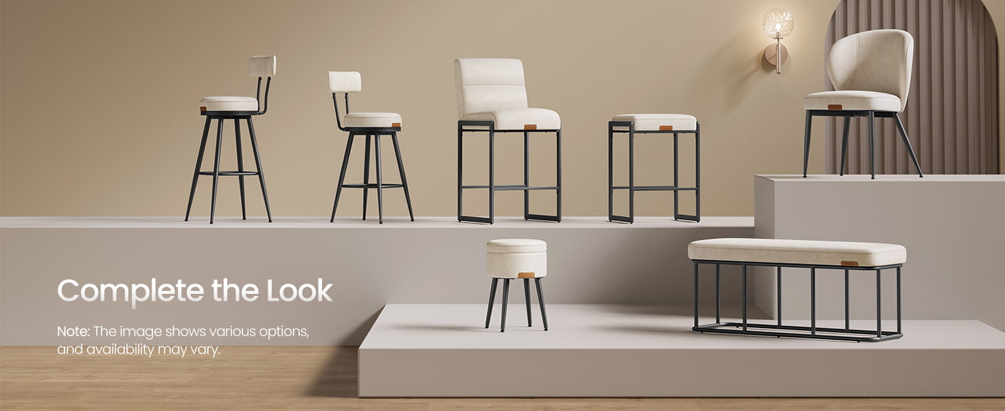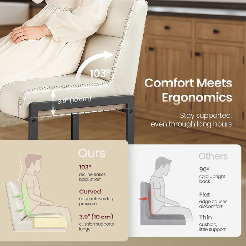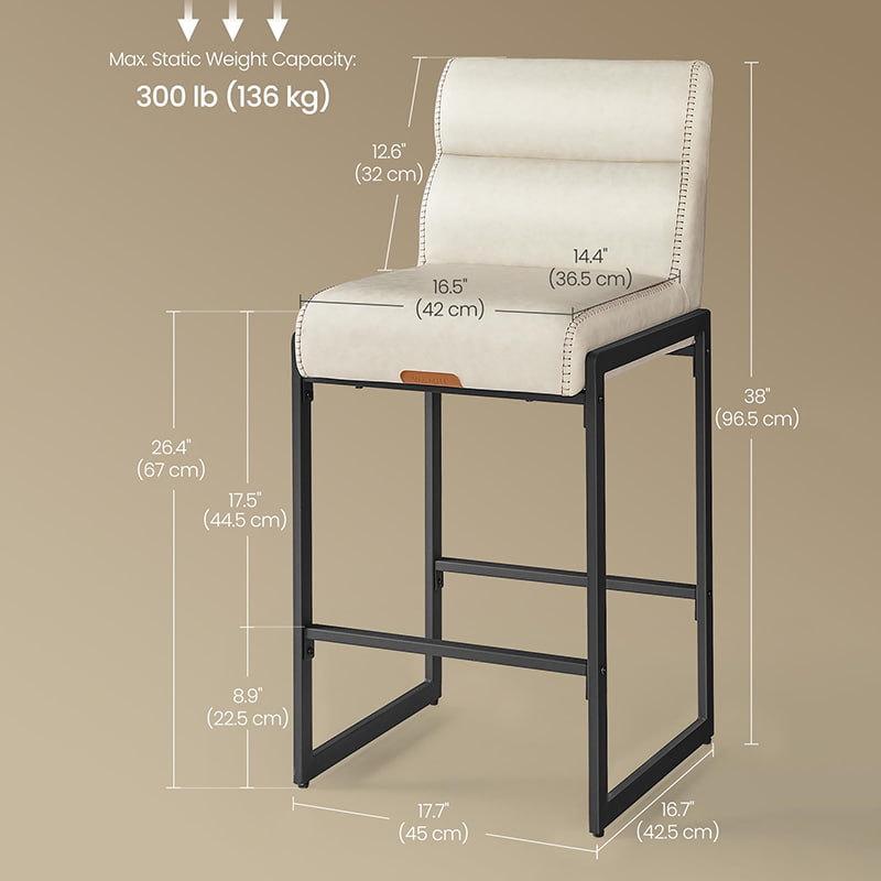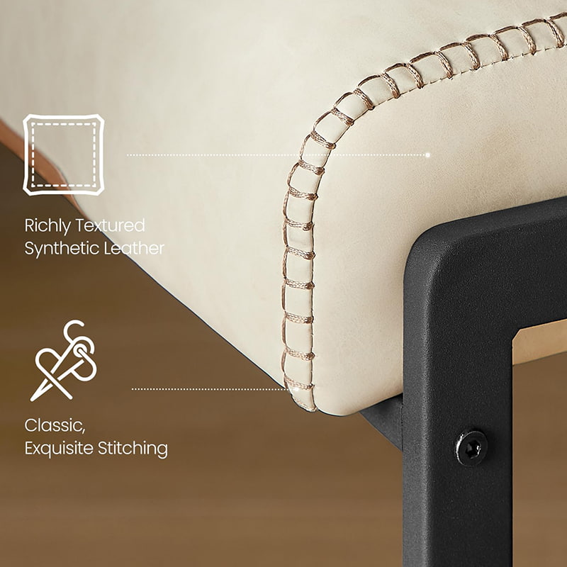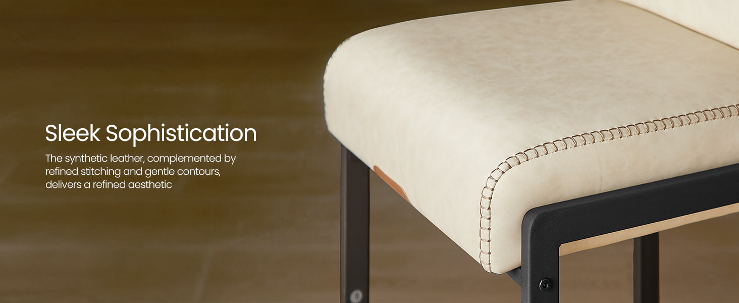 Kursi bar modern abad pertengahan yang dirancang untuk meja dapur dan ruang makan, kursi counter-height berwarna putih krem ini memiliki pelapis kulit sintetis yang tahan lama dengan jahitan halus dan bingkai logam arsitektur yang bersih. Sandaran punggung tersegmentasi 103 derajat yang ergonomis, kursi empuk setebal 3,9 inci, dan tepi depan melengkung memberikan kenyamanan jangka panjang untuk duduk lebih lama, menjadikannya cocok untuk dapur perumahan dan lingkungan komersial ringan seperti kafe atau ruang pamer.