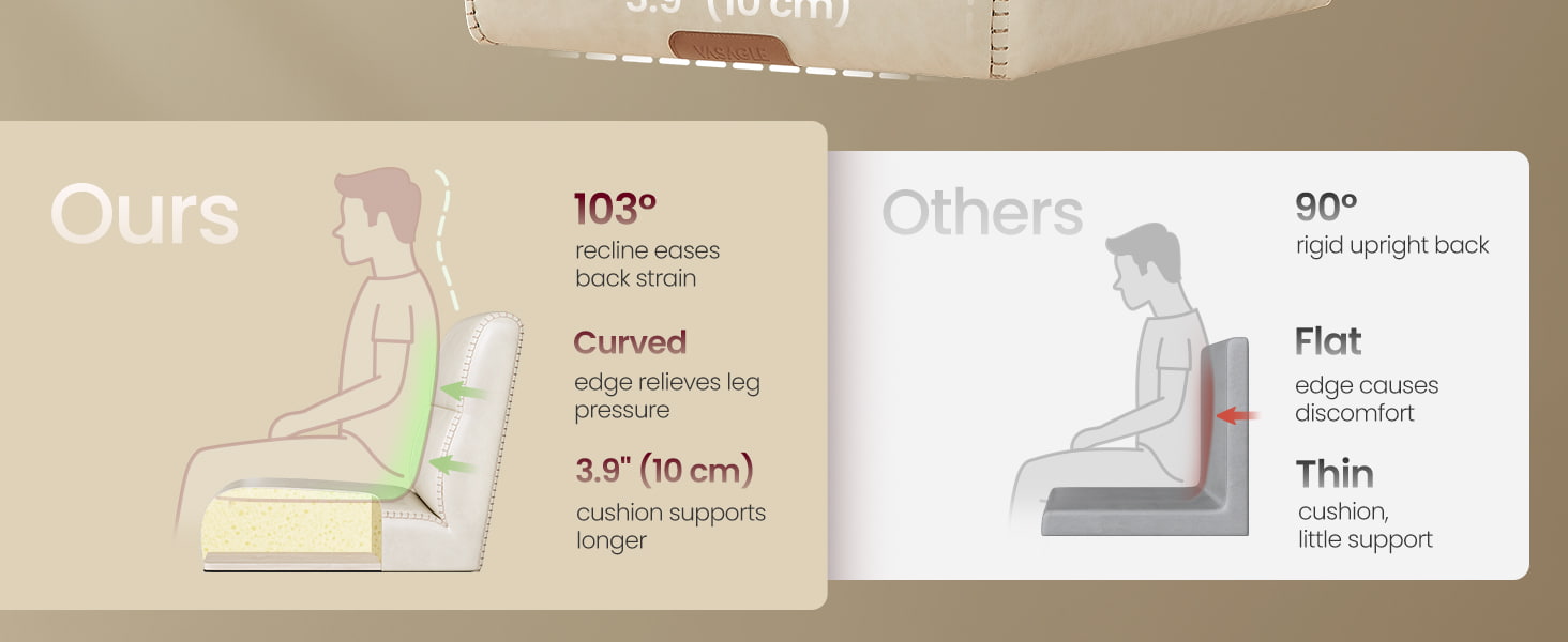 ● Tepi kursi melengkung untuk mengurangi tekanan pada kaki saat duduk dalam waktu lama